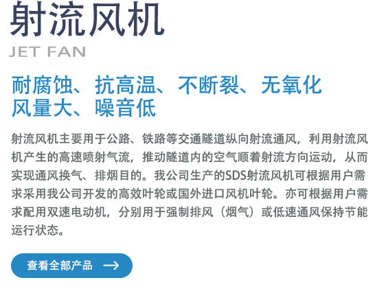 成功研發(fā)和引進(jìn)了SDF型隧道節(jié)能風(fēng)機(jī)和SDS型隧道射流風(fēng)機(jī),有超長(zhǎng)的送風(fēng)距離、良好的節(jié)能效果。