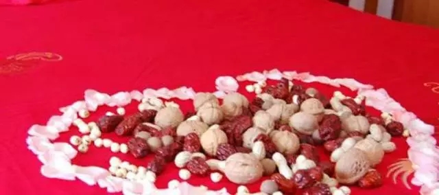六、鋪床的流程:鋪床過程根據各地風俗不同略有差別,老一輩都知道,一般鄰居中都有這樣的人。主要流程除了掃床、鋪鴛鴦枕、龍鳳被之外,就是“撒帳(撒床)”了,將花生、桂圓、蓮子、栗子、棗等干果鋪撒在婚床上,取義“早立子、蓮生子、花生子(兒女雙全)”的祈愿。
