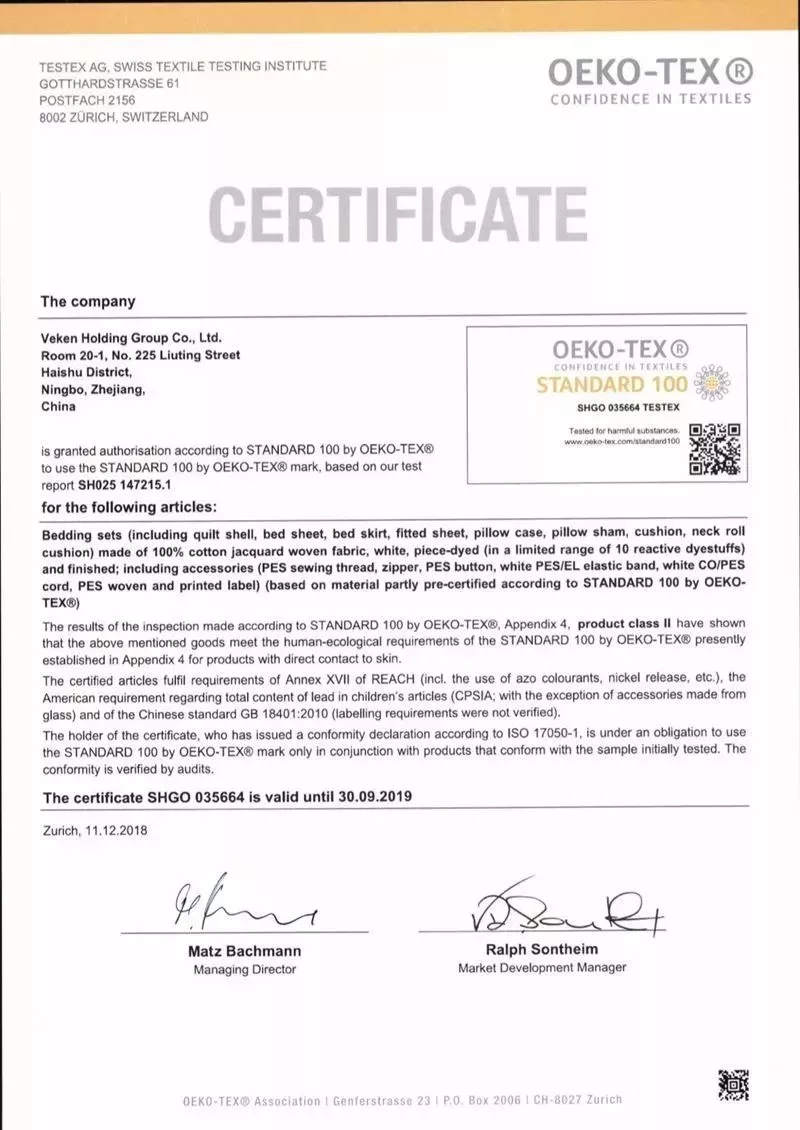 該證書標簽適用產品為:床上用品(被套、床單、床圍、靠墊套、護頸套)由白色、經匹染(染料的適用范圍僅限于已申報的10支活性染料)和后整理的全棉提花梭織面料制成;輔料包括(滌綸縫紉線、拉鏈、滌綸紐扣、白色滌綸/氨綸松緊帶、白色滌棉抽繩、滌綸織標和印標)(部分使用有STANDARD 100 by OEKO-TEX證書的原材料)。
