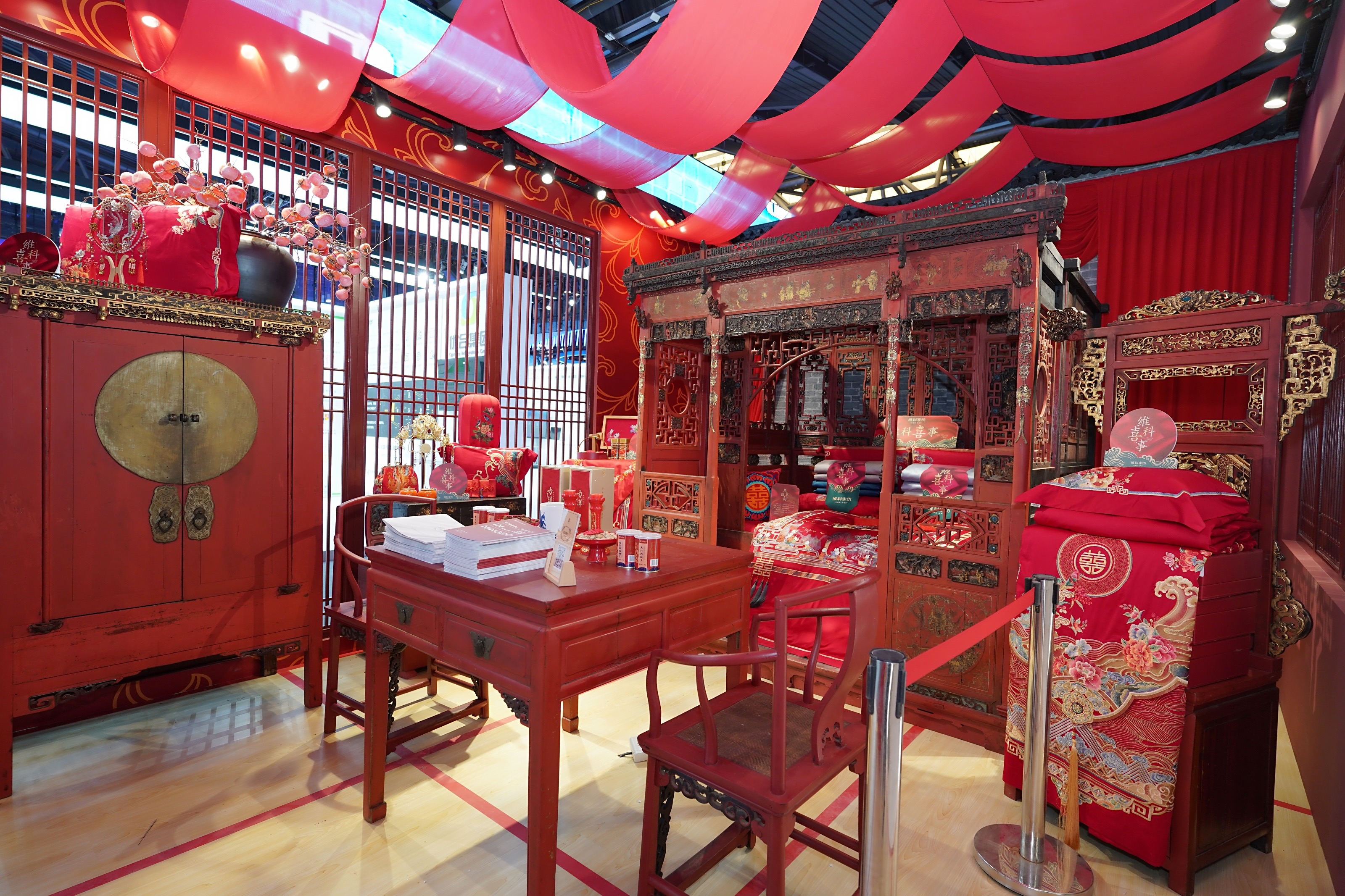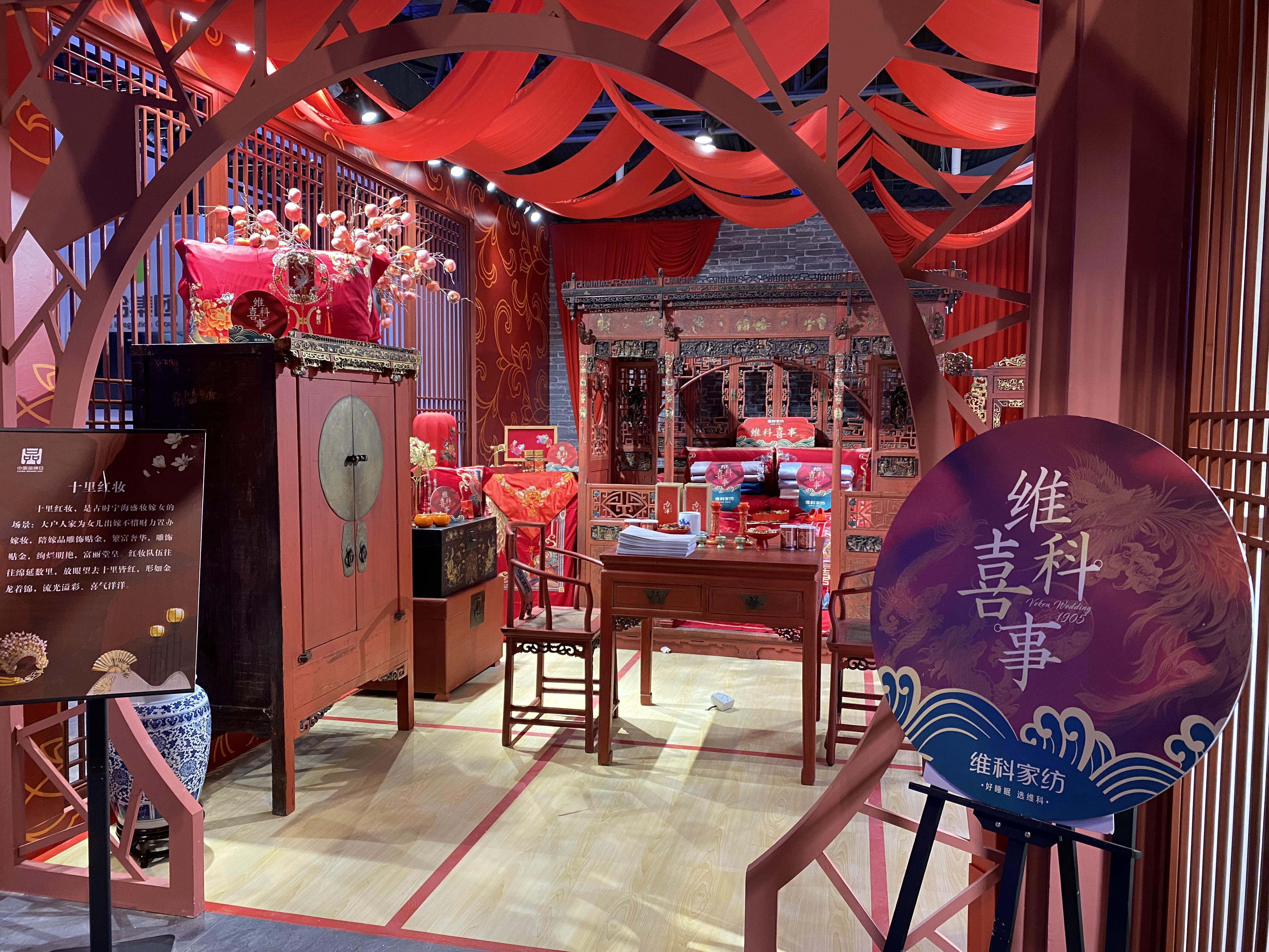寧波發改委的相關負責人表示,由維科家紡精心打造的古代婚房是本次寧波館展廳的一大亮點。通過重工刺繡的婚慶套件【百子百福】【龍章鳳彩】【錦繡年華】、華美的鳳冠喜扇等展品,結合收藏夾協會提供的長達兩百年歷史的古董家具,展現了濃厚的婚慶氛圍和傳統文化的精髓,將“十里紅妝”的獨特魅力展現得淋漓盡致。