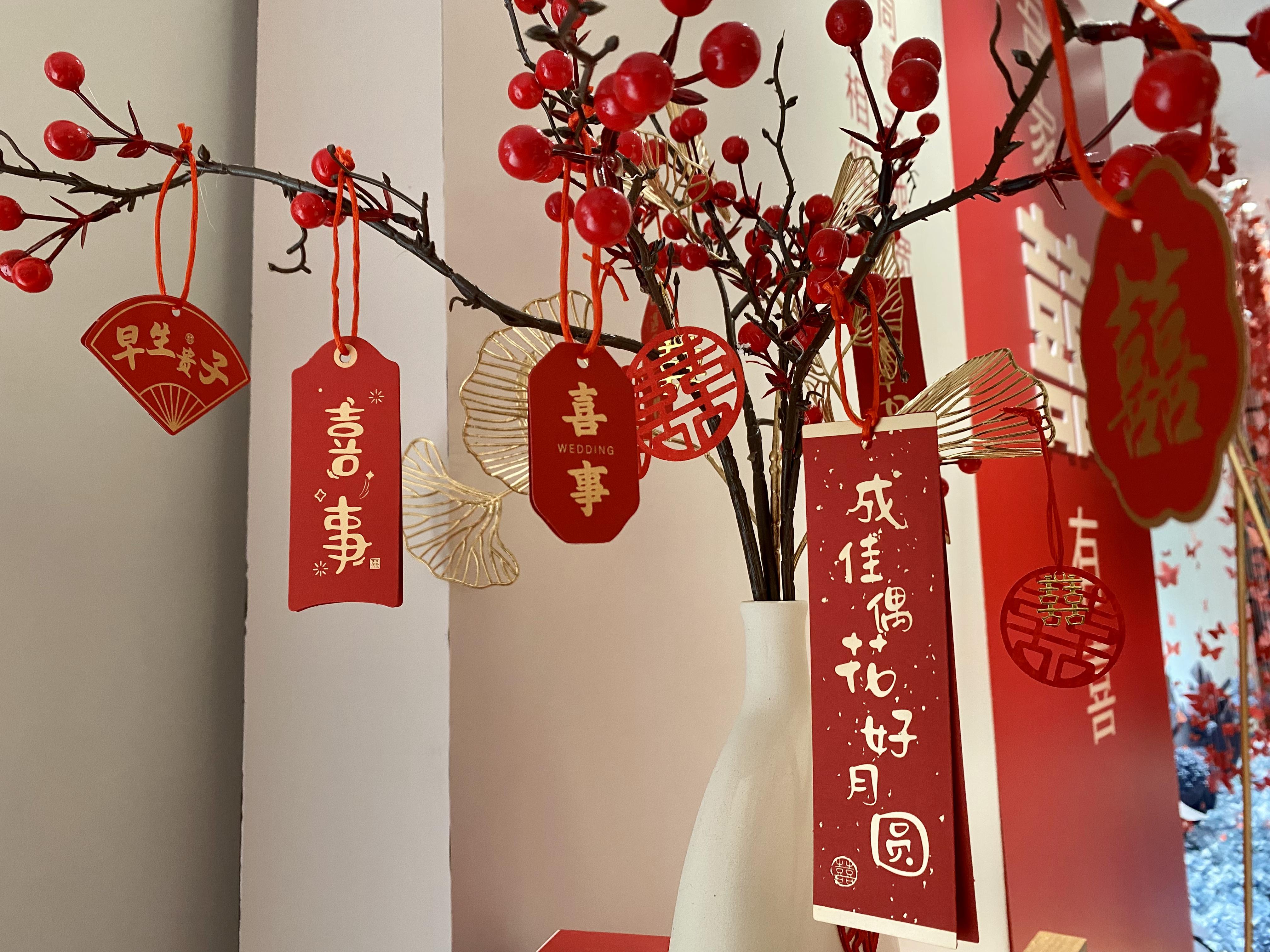 婚慶區通過精美的垂掛之“囍”、婚禮唱片機、維科喜樹等道具營造出浪漫而喜慶的氛圍,創造了一個令人陶醉的夢境。
